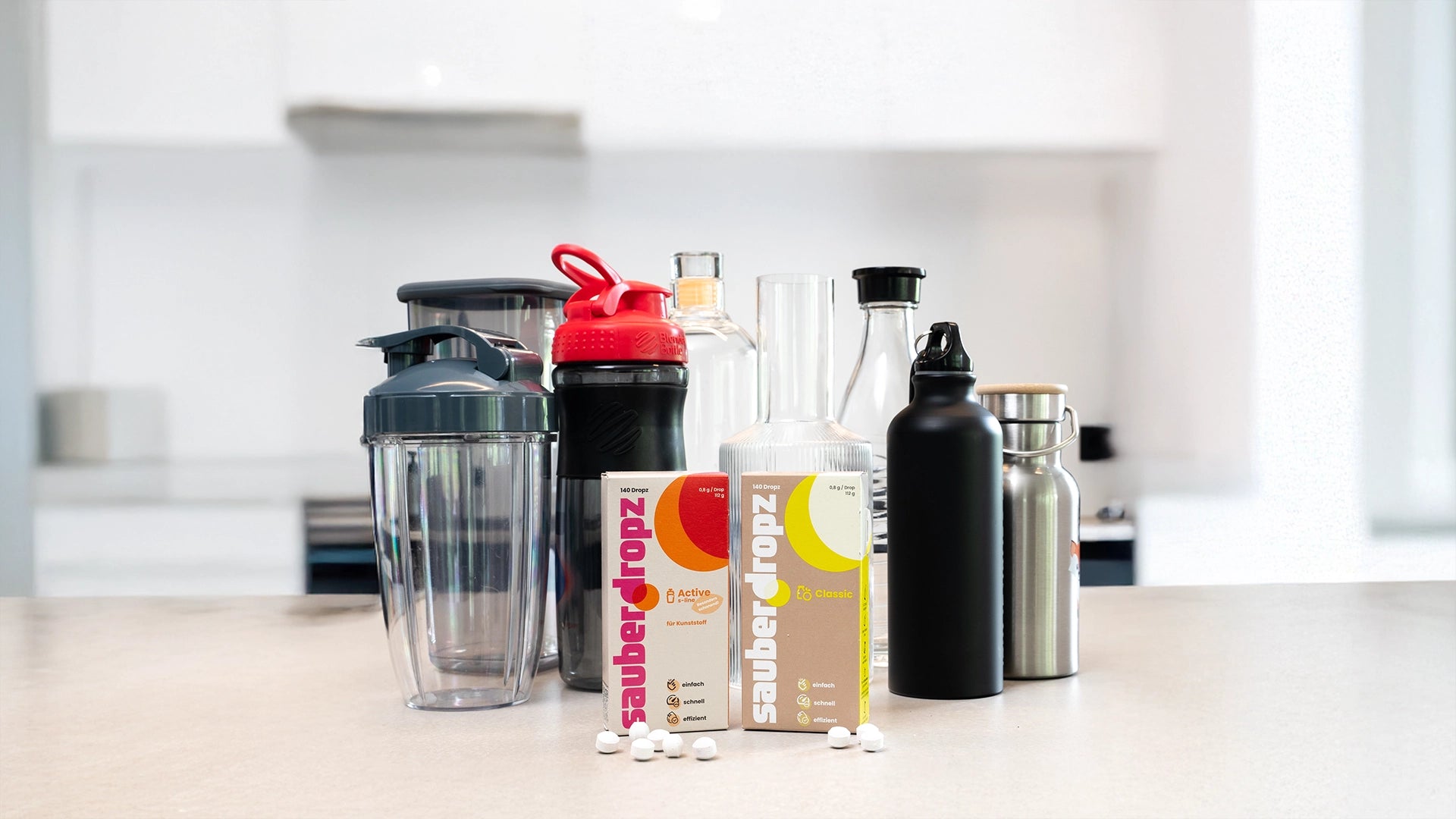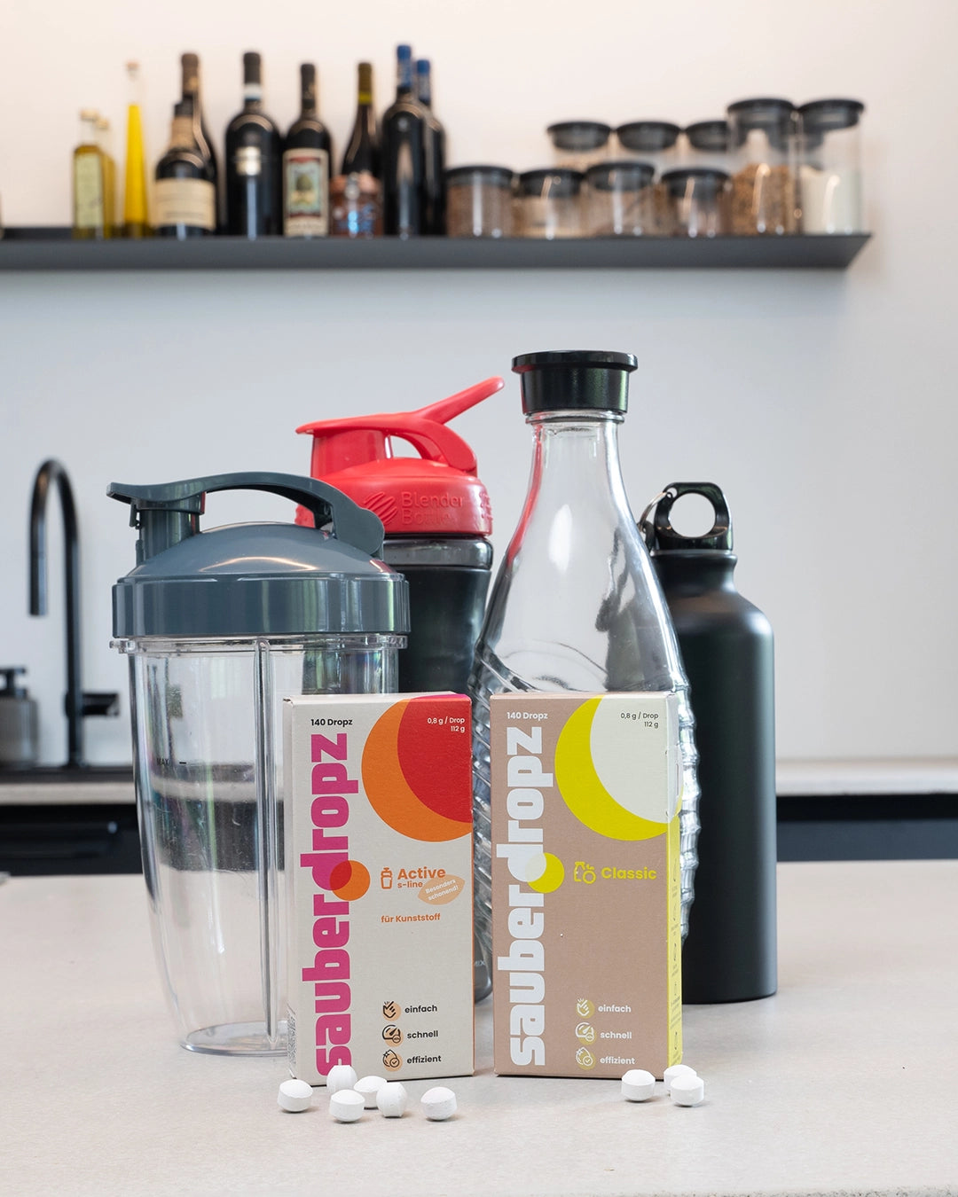 Sauberdropz reinigen dort, wo Bürsten und Spülmaschinen an ihre Grenzen kommen – in Flaschen, Karaffen, Thermobechern oder Vasen.